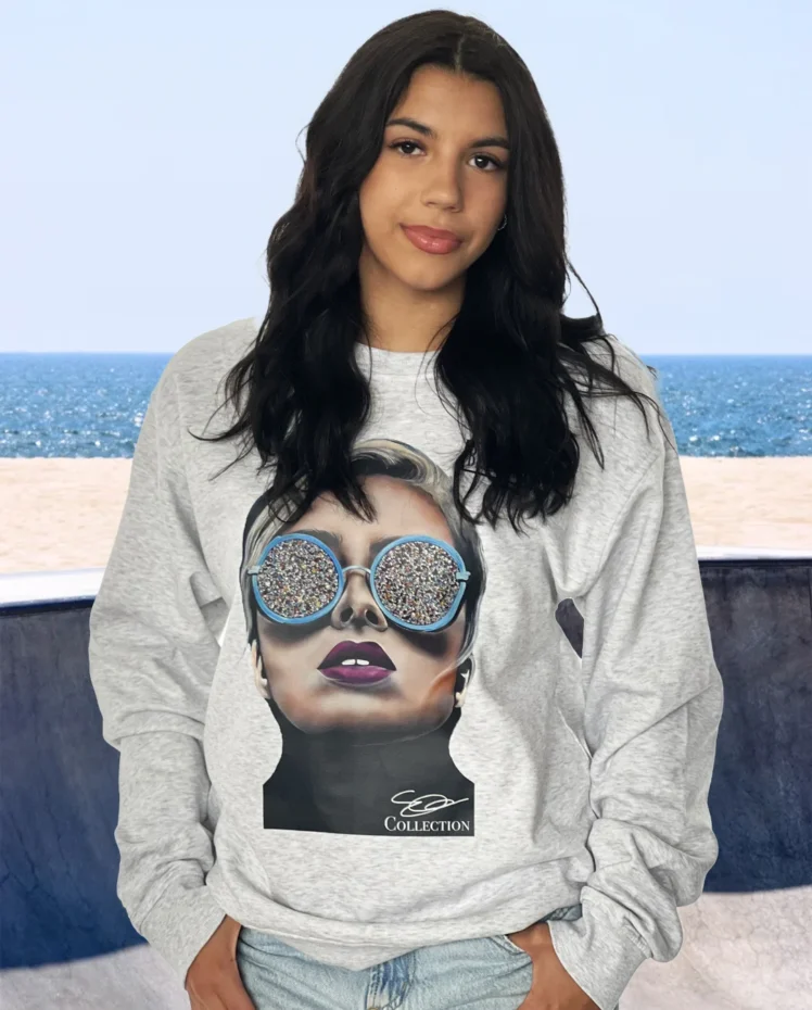 Inspired by Émilie Gosselin, Boss In Color reveals a heroine behind color-splashed lenses where perseverance comes into focus. Her path is as vibrant as her glasses. Every deliberate step, no matter how small, brings her closer to her goal. Printed on a light grey crewneck with an urban edge, this graphic blends quiet strength with creative energy. Wearable art that celebrates determination, confidence, and boldness.
