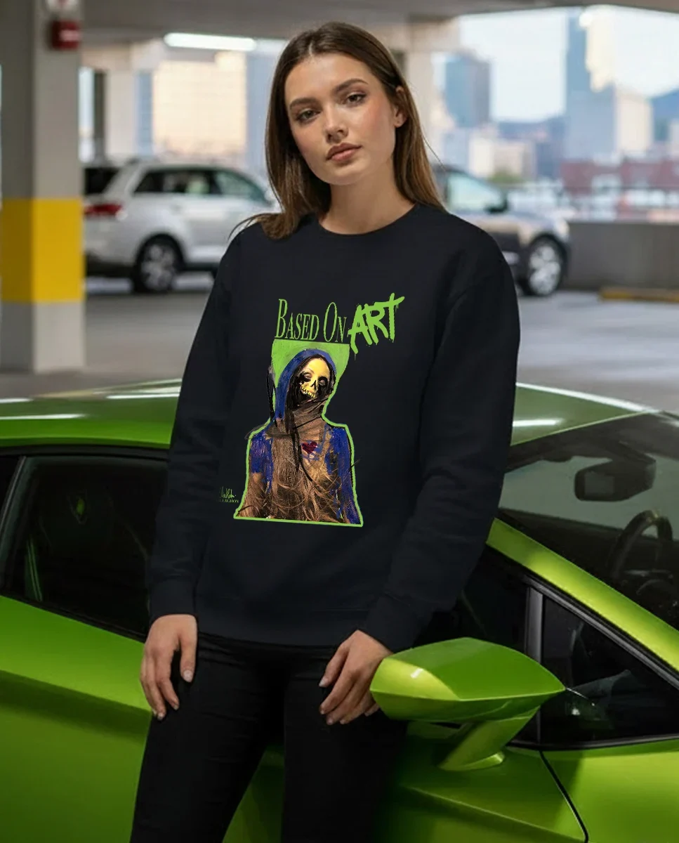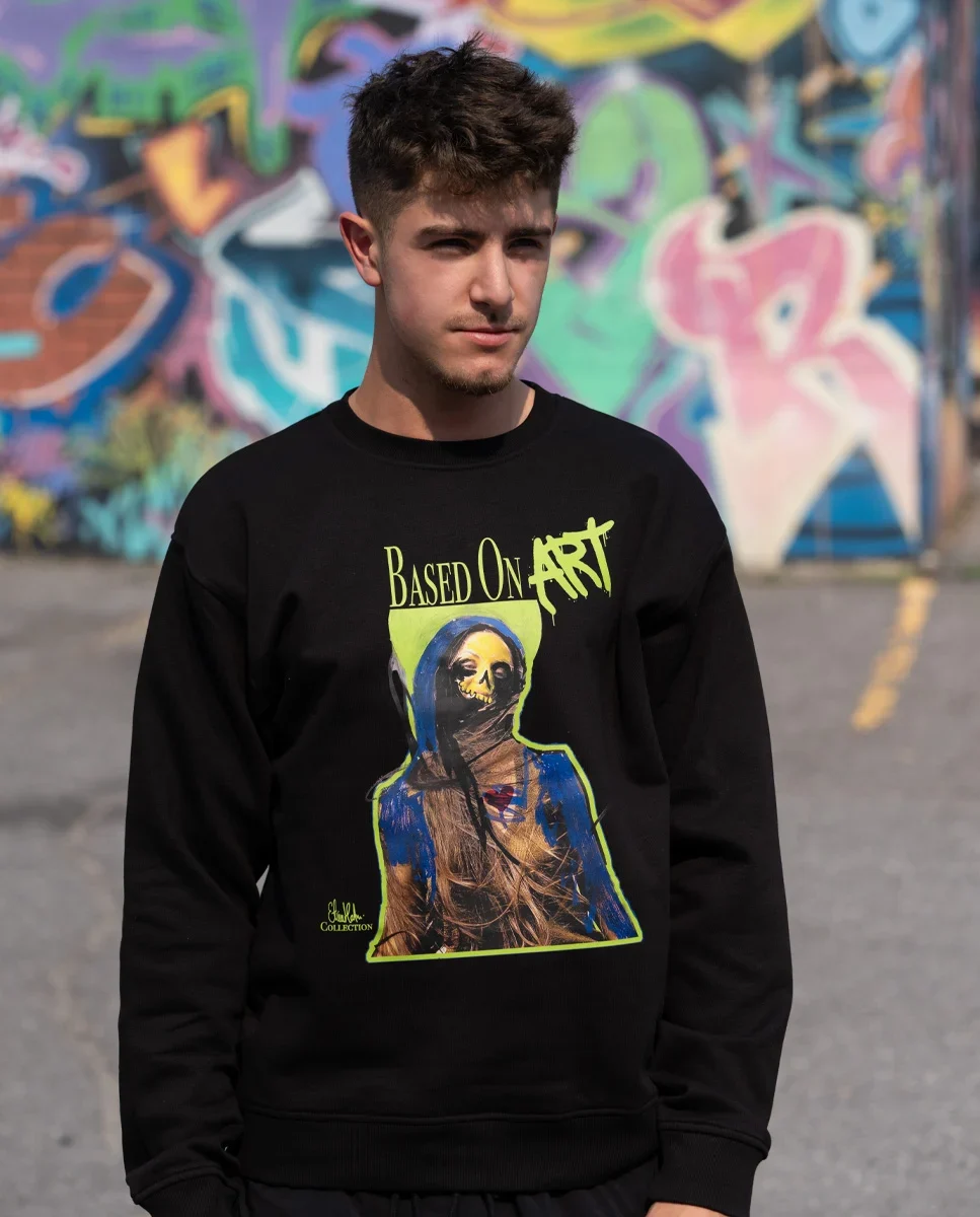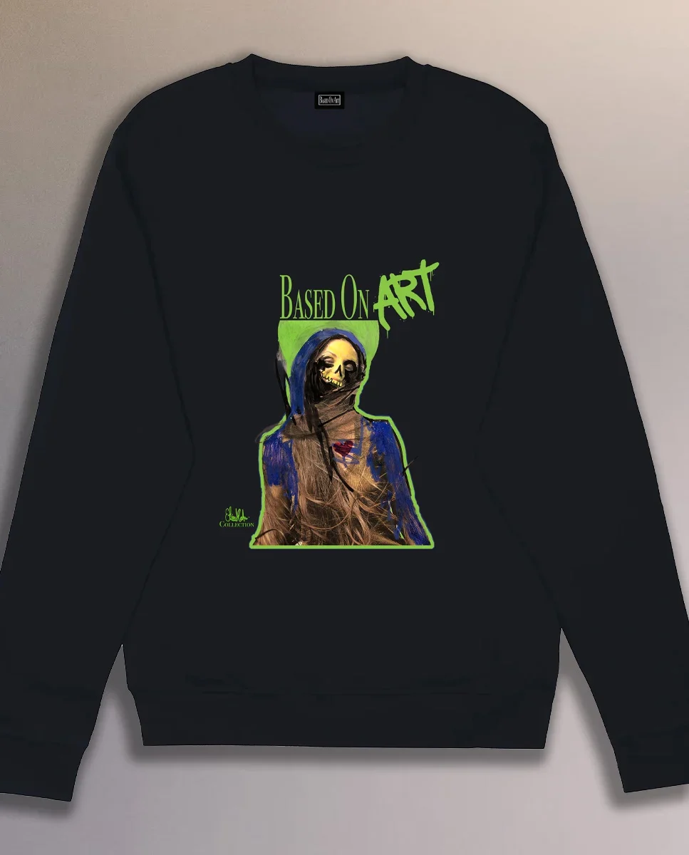 Printed on a black crew neck sweater, the artwork stands out with strong contrast and a clean, modern silhouette. This is art-inspired apparel made for everyday wear, comfortable, minimal in base color, yet bold in meaning. A perfect choice for collectors, creatives, and anyone looking for wearable contemporary art that feels distinctive and authentic.