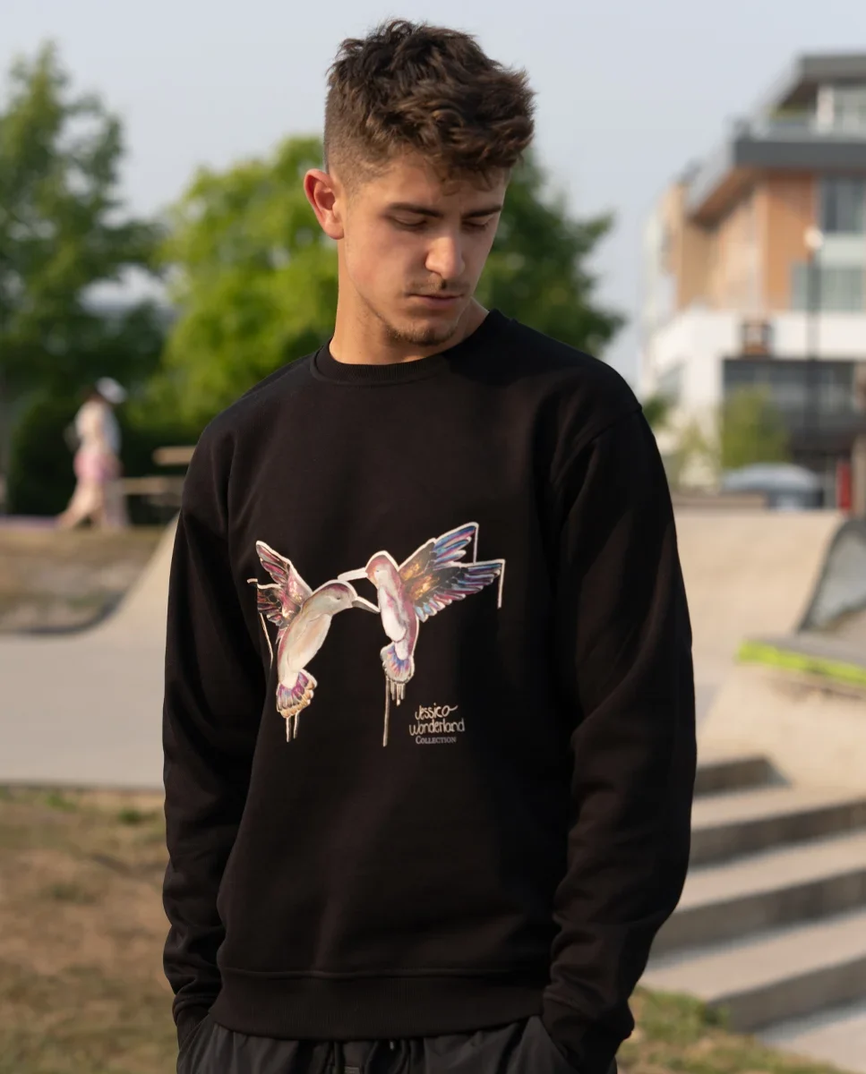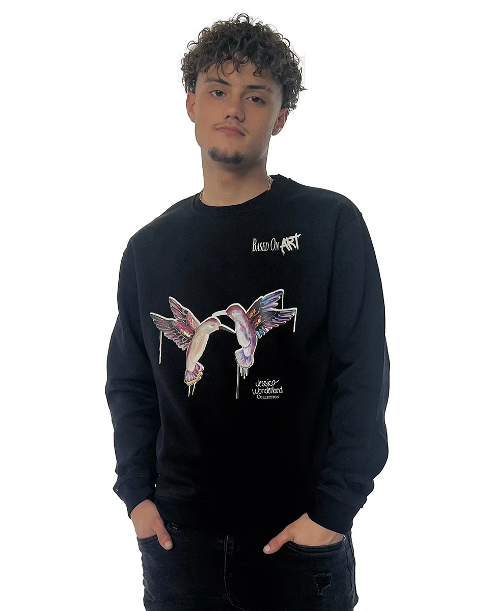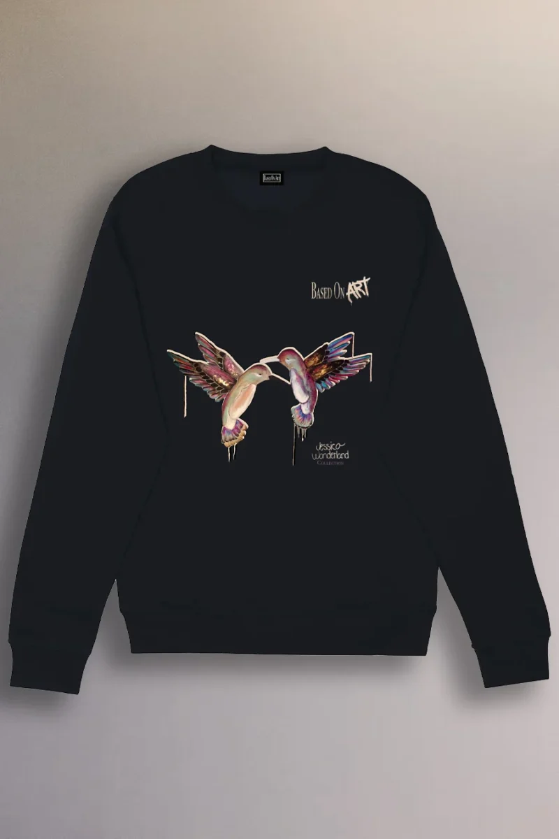 Hummingbirds Lovers is this black artistic crewneck designed by Jessica Wonderland for Based On Art features a delicate and luminous artwork where two hummingbirds appear in dialogue. These graceful birds symbolize pure, free, and universal love, expressing a deep connection that goes beyond words, boundaries, and time.