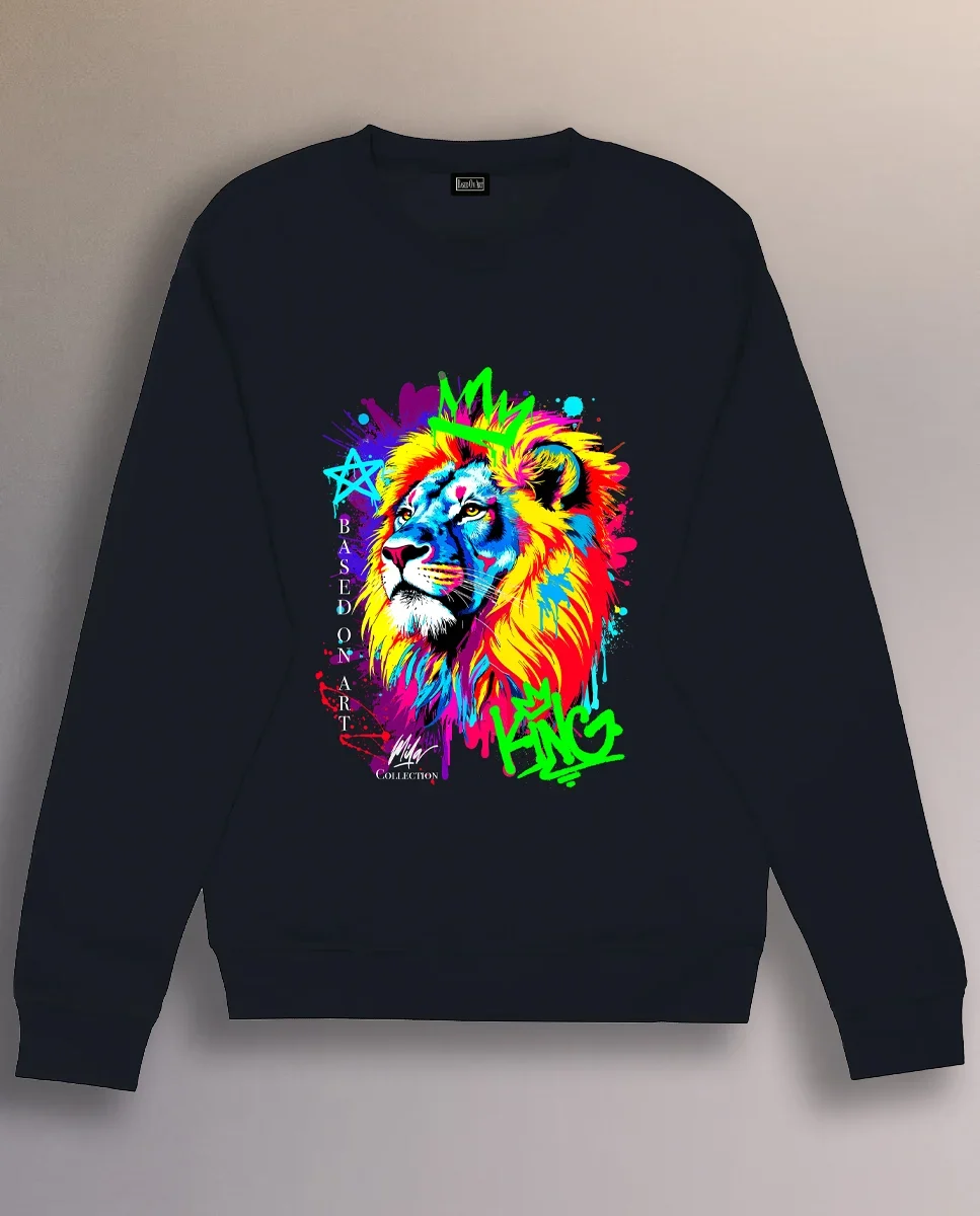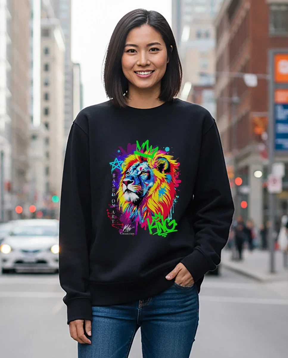 Discover the Based On Art universe with the unisex King crew neck, a key piece from our artistic streetwear collection. More than a basic sweatshirt, this crew neck sweater is a wearable work of art, created from an original painting by Quebec visual artist Julie-Mila Bouffard. The design features a bold, colorful lion, graphic, expressive, and urban, with a refined touch of abstraction rooted in contemporary streetwear fashion.