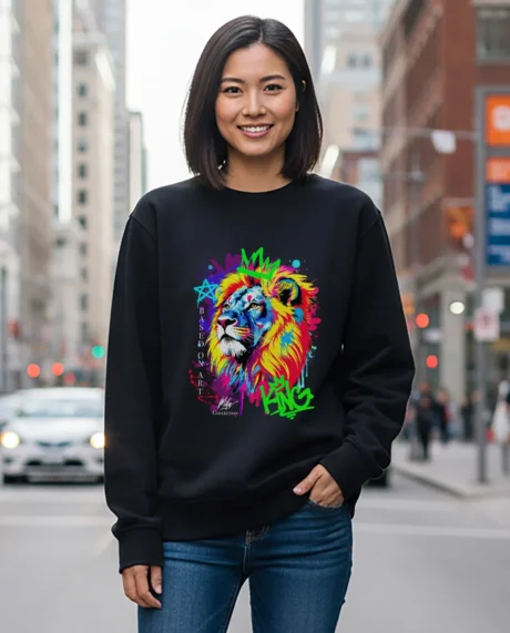 Designed as a unisex crew neck / round-neck sweatshirt, the “King” offers all-day comfort, a relaxed fit, and versatile styling. Easy to wear and easy to pair, it fits seamlessly into urban fashion, street style, and modern casual wardrobes while remaining visually impactful.