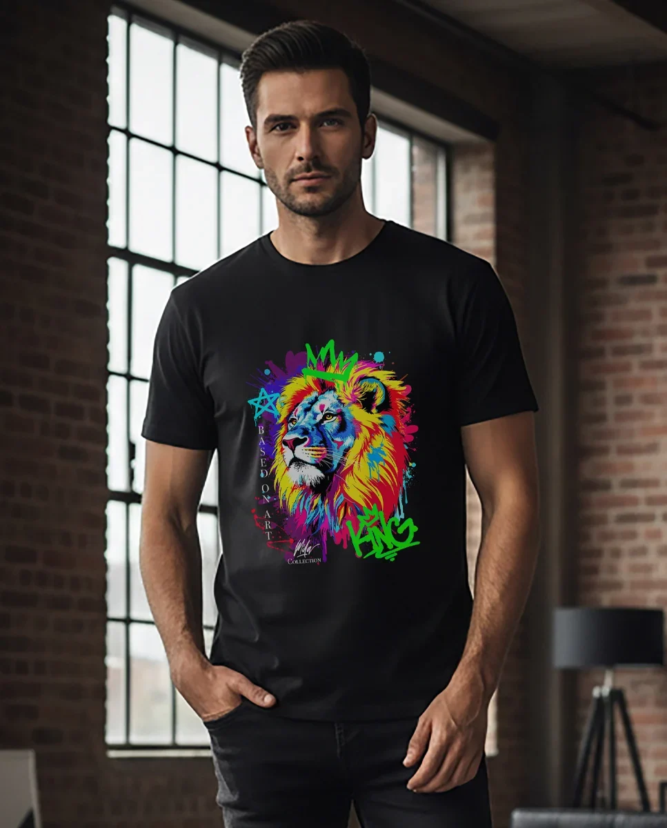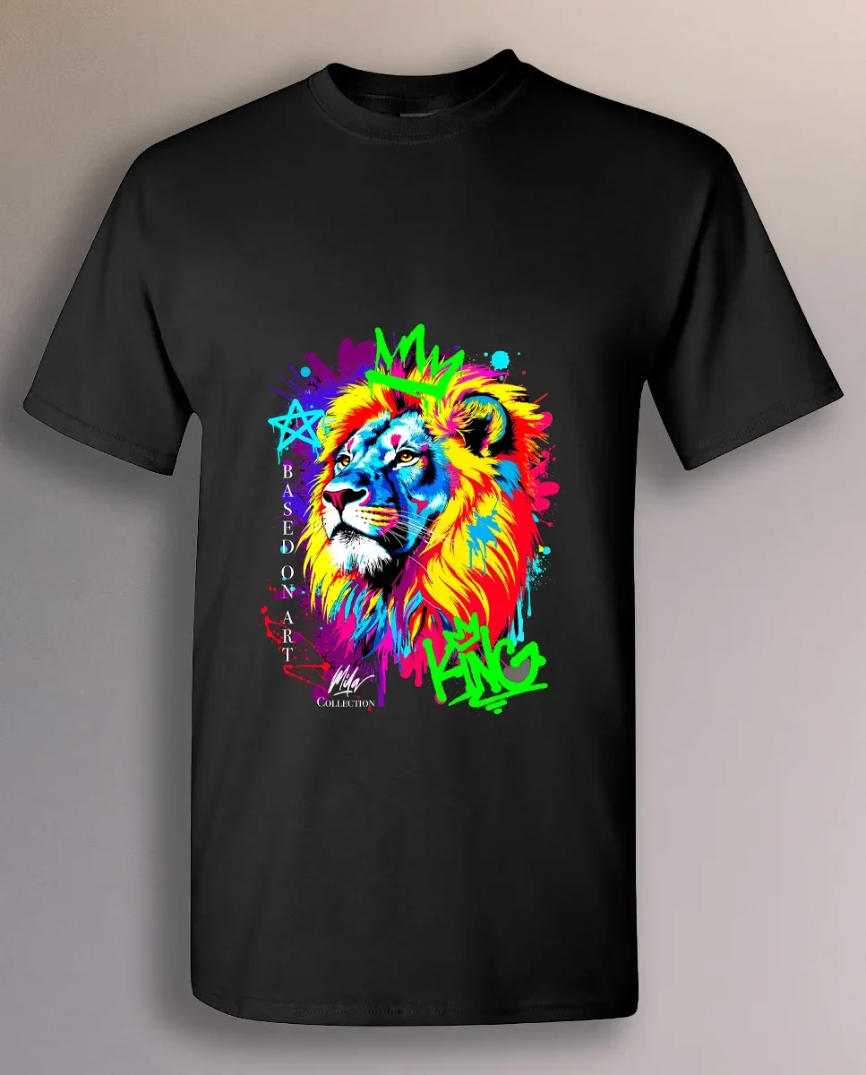 Step into the world of Based On Art with the unisex King T-shirt, a statement piece from our artistic streetwear collection. More than just a T-shirt, this garment is a wearable work of art created by Quebec painter Julie Mila Bouffard. The design features a bold, colorful lion, raw, expressive, and full of life, blending street style, graphic energy, and a touch of abstraction.