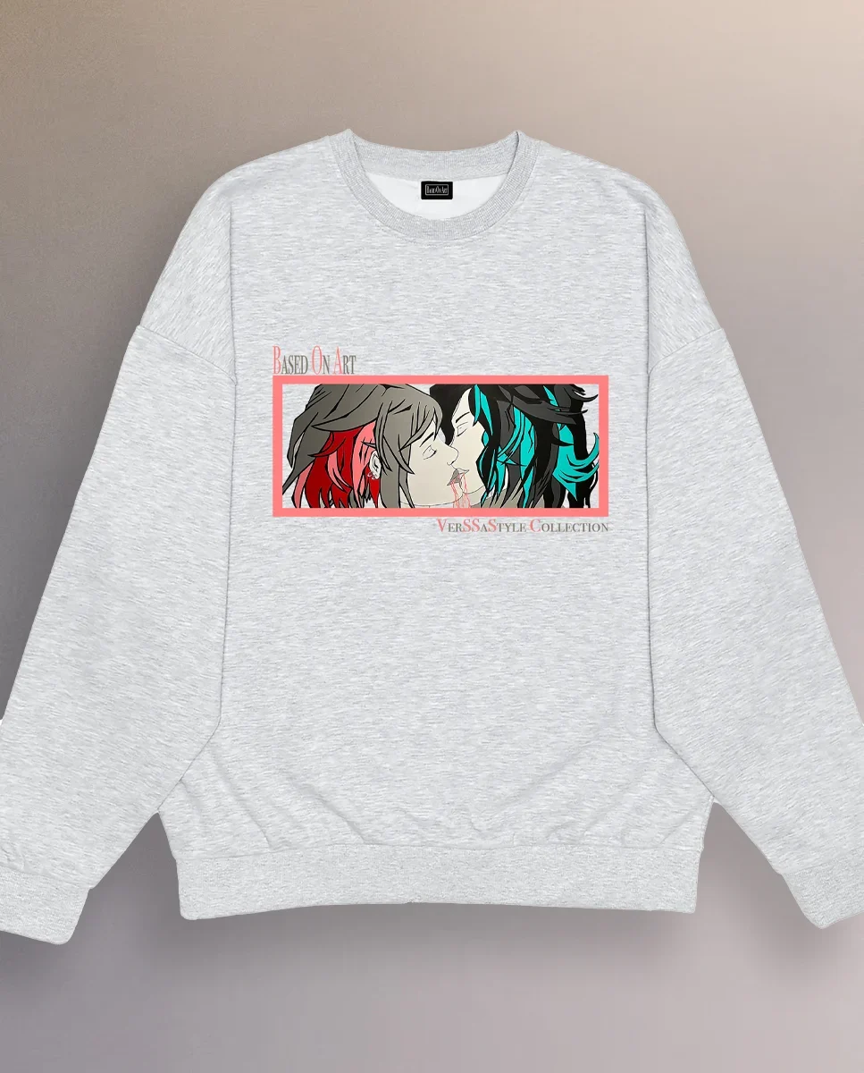 The Kissing Girlz unisex grey crewneck by Based On Art, created by artist VerSSaStyle, presents a powerful, intimate, and provocative artwork focused on human connection. The visual captures a moment between two individuals drawn to each other, where attraction and emotion take center stage.