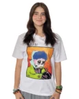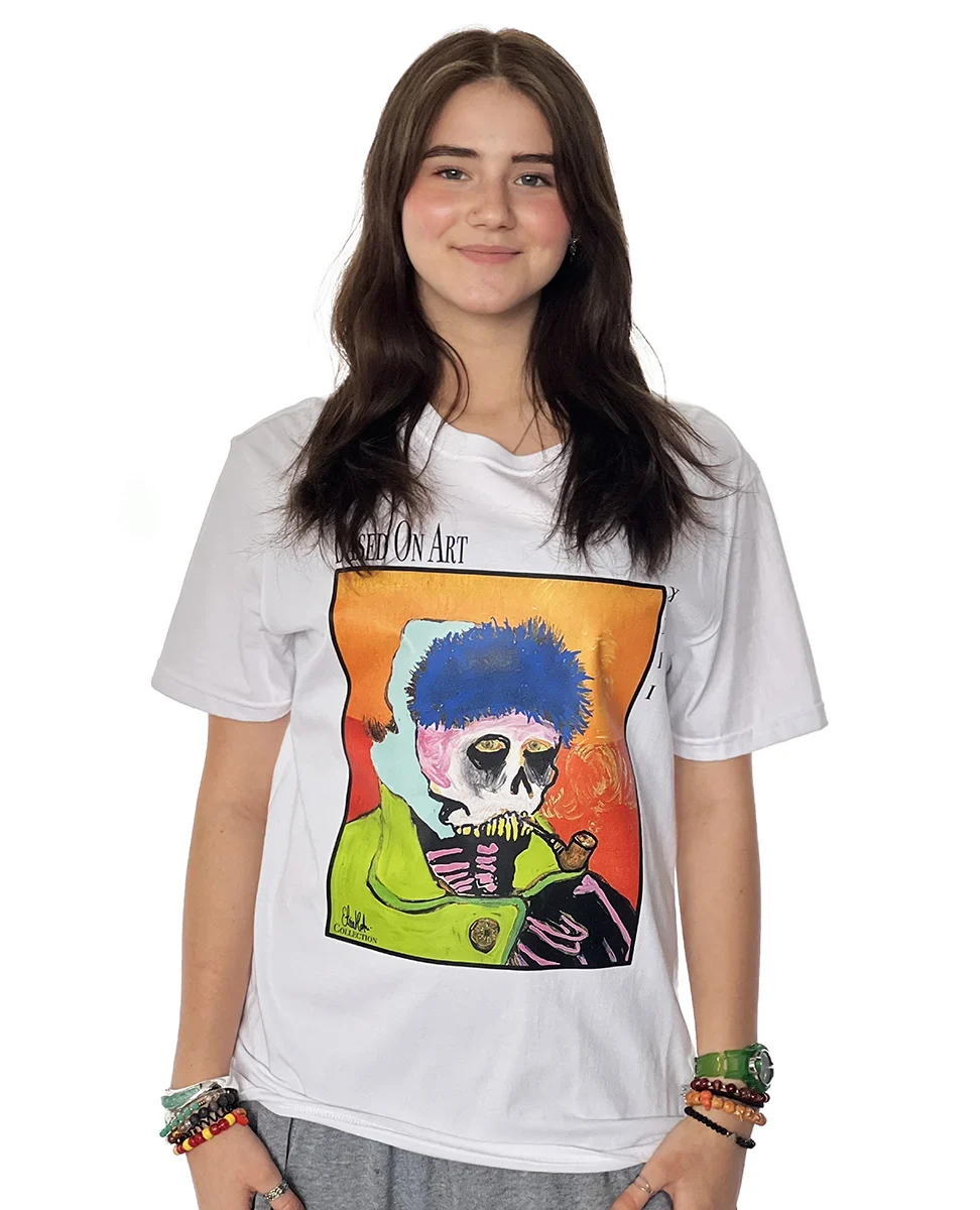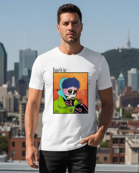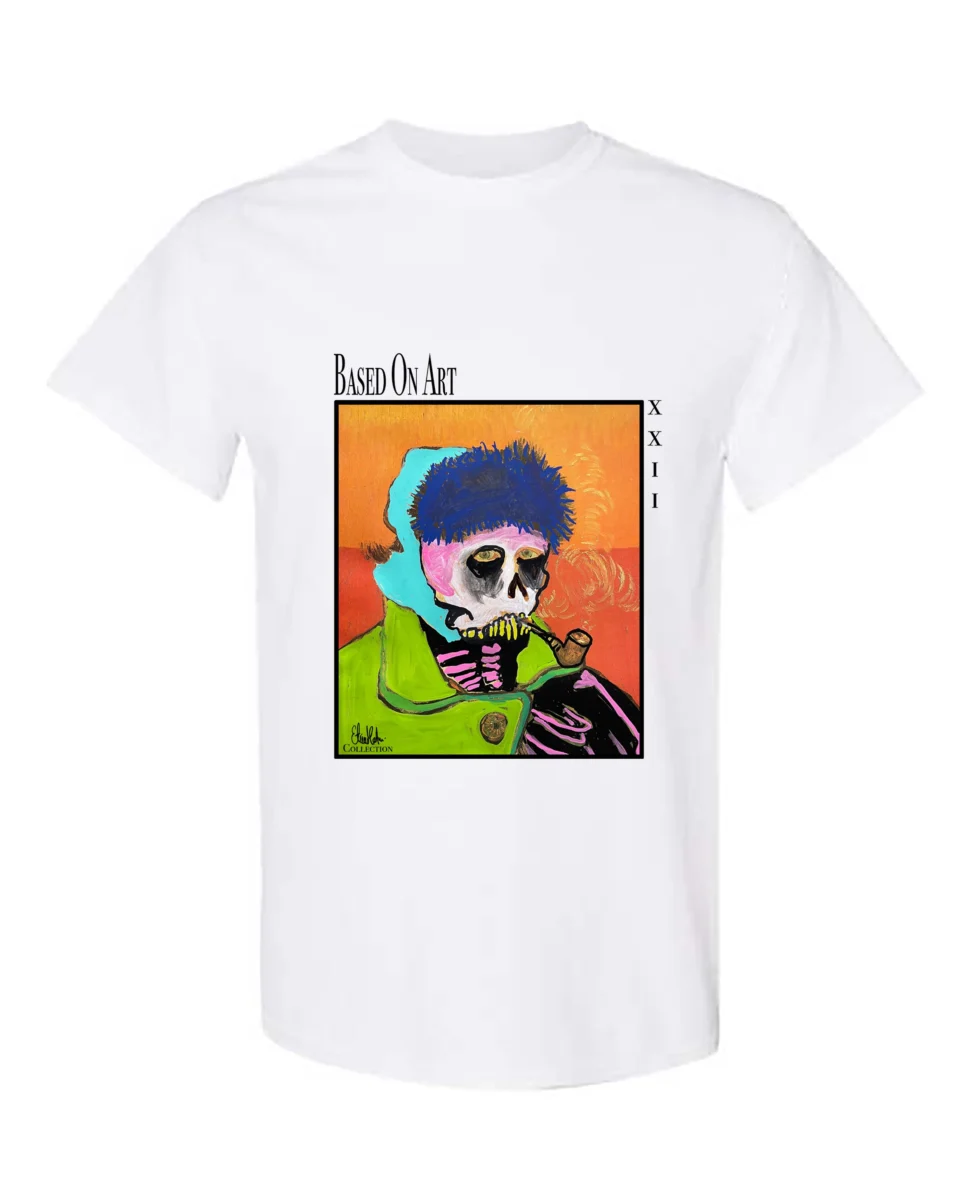 This white artistic t-shirt designed by Étienne Martin for Based On Art showcases a unique artwork where contemporary art, visual storytelling, and symbolism converge. The illustration depicts a man with a skeleton-like appearance, outdoors in a winter setting, calmly smoking a pipe. A frozen moment in time, rich in meaning and open to interpretation.