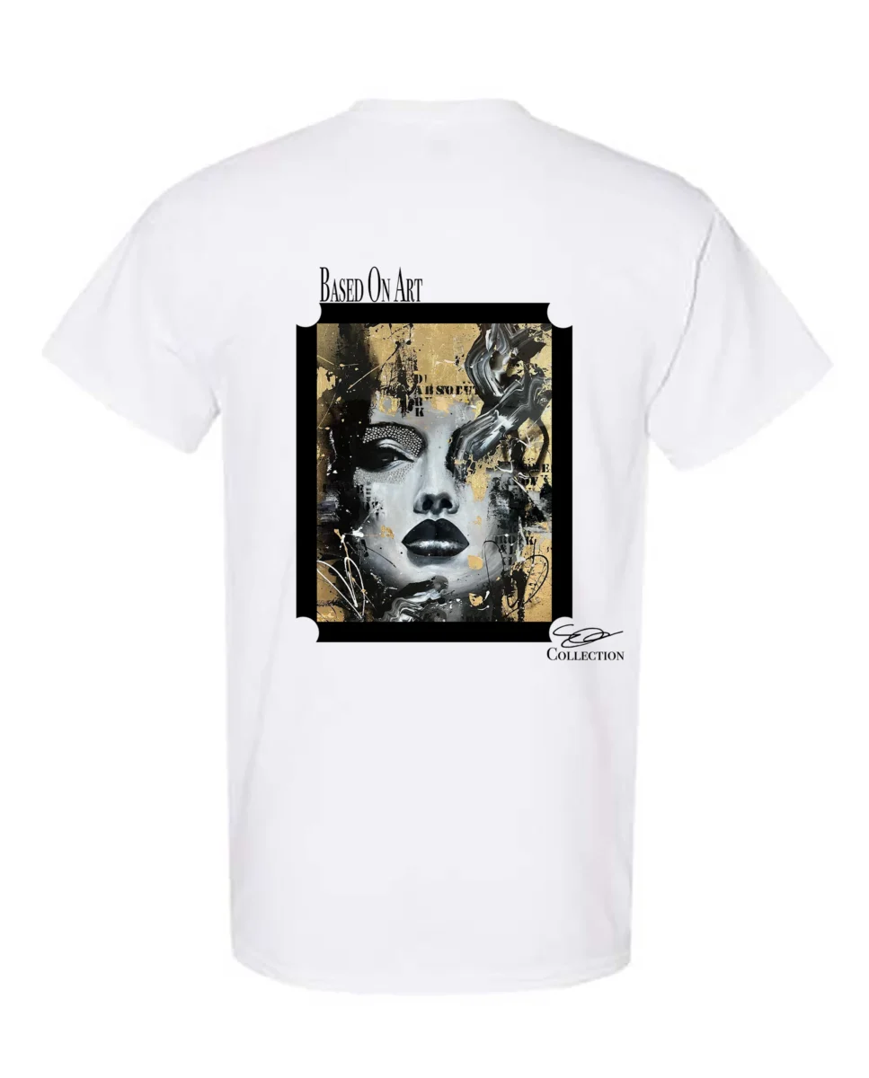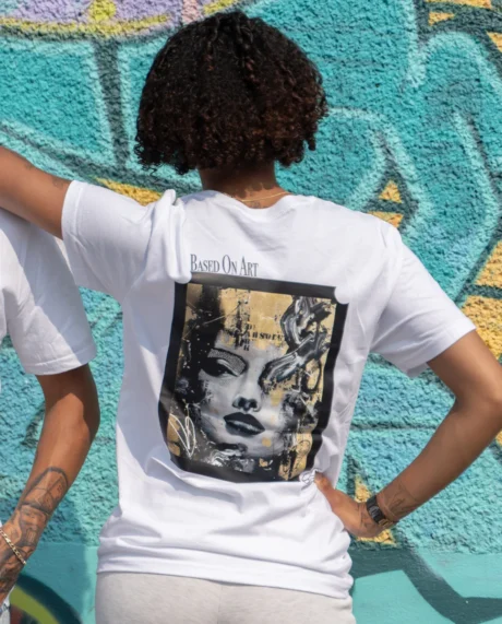 Printed on a white T-shirt, the design is enhanced by light and contrast, allowing the artwork’s depth and details to fully emerge. This contemporary art T-shirt embodies the spirit of Based On Art, where fashion becomes a medium for wearable contemporary art.