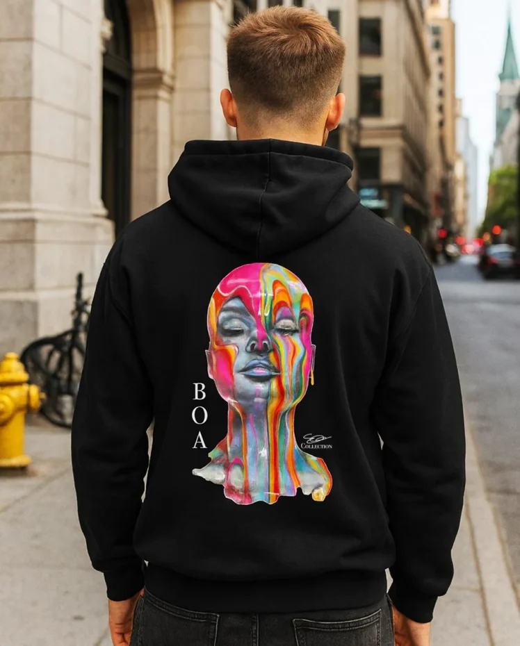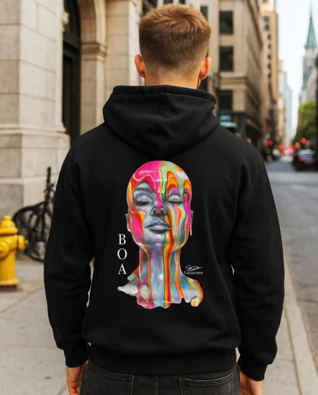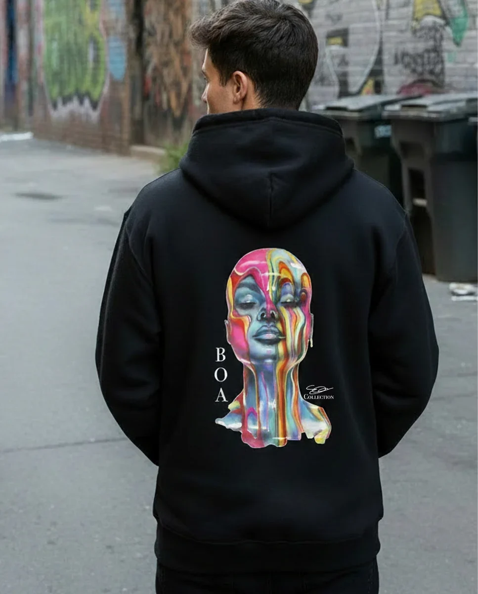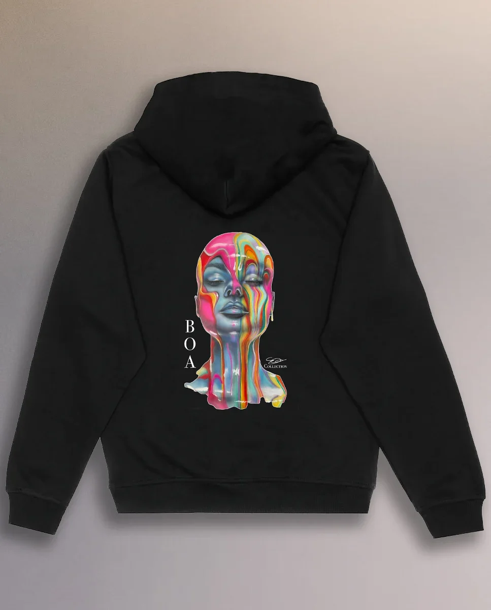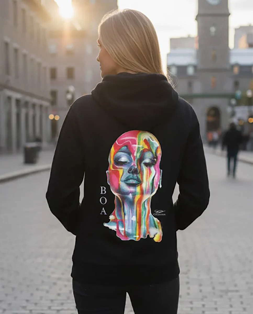 The artwork features an abstract female portrait, crossed by intense colors and fluid textures. Each flowing layer suggests movement, emotion, and inner strength, as if the portrait is shaped by energy and feeling. Every mark tells a story, making this hoodie a true piece of wearable contemporary art.