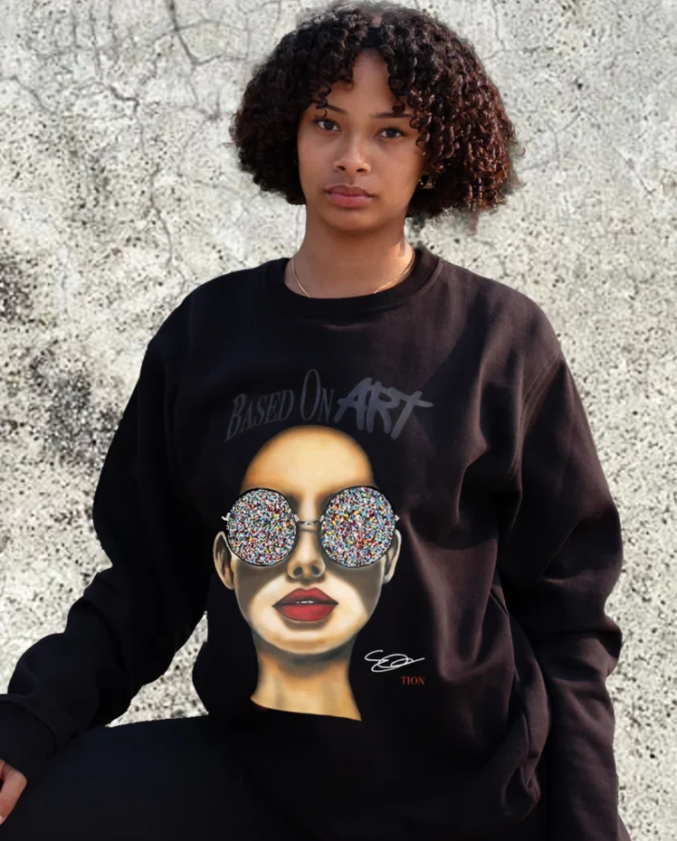 This artwork by Émilie Gosselin, from the IN COLOR collection, portrays a woman standing proudly and confidently. Bald and wearing glasses adorned with colorful crystals, she embodies freedom and boldness in a bright, festive universe.