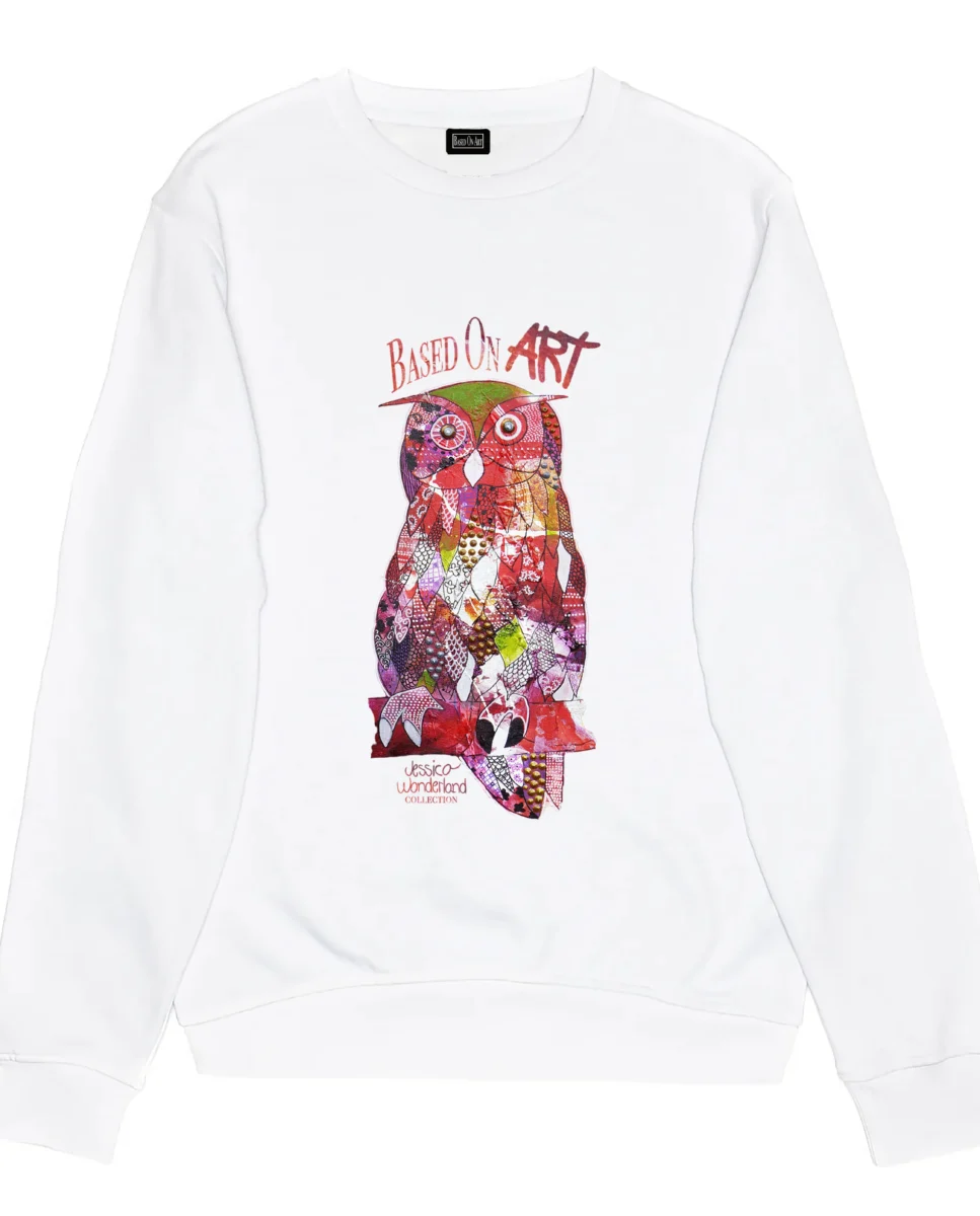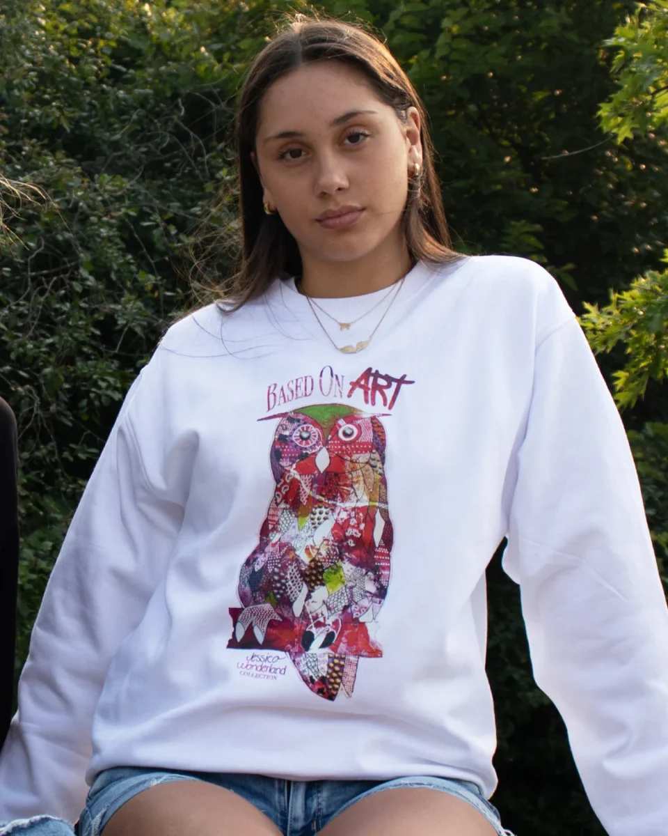 Red Owl, this white artistic crewneck designed by Jessica Wonderland for Based On Art showcases a bold and confident artwork. A red-toned owl with a striking gaze and undeniable presence. Created for strong, self-assured minds, this design symbolizes independence, resilience, and inner strength.