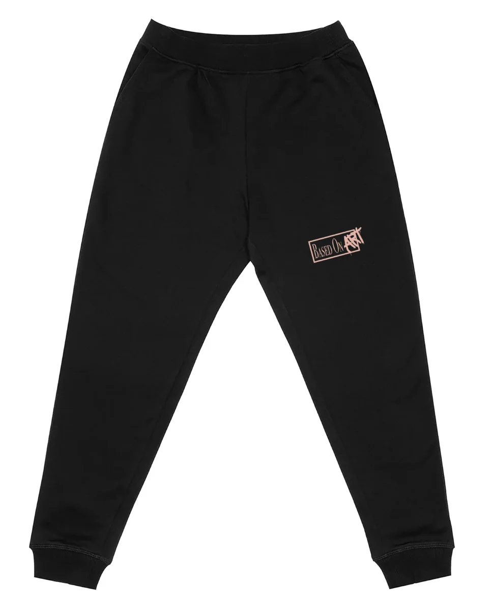 The pale pink Based On Art logo adds a refined contrast to the black fabric, reinforcing a minimalist and artistic aesthetic. It’s a detail that elevates the joggers while staying understated and wearable.