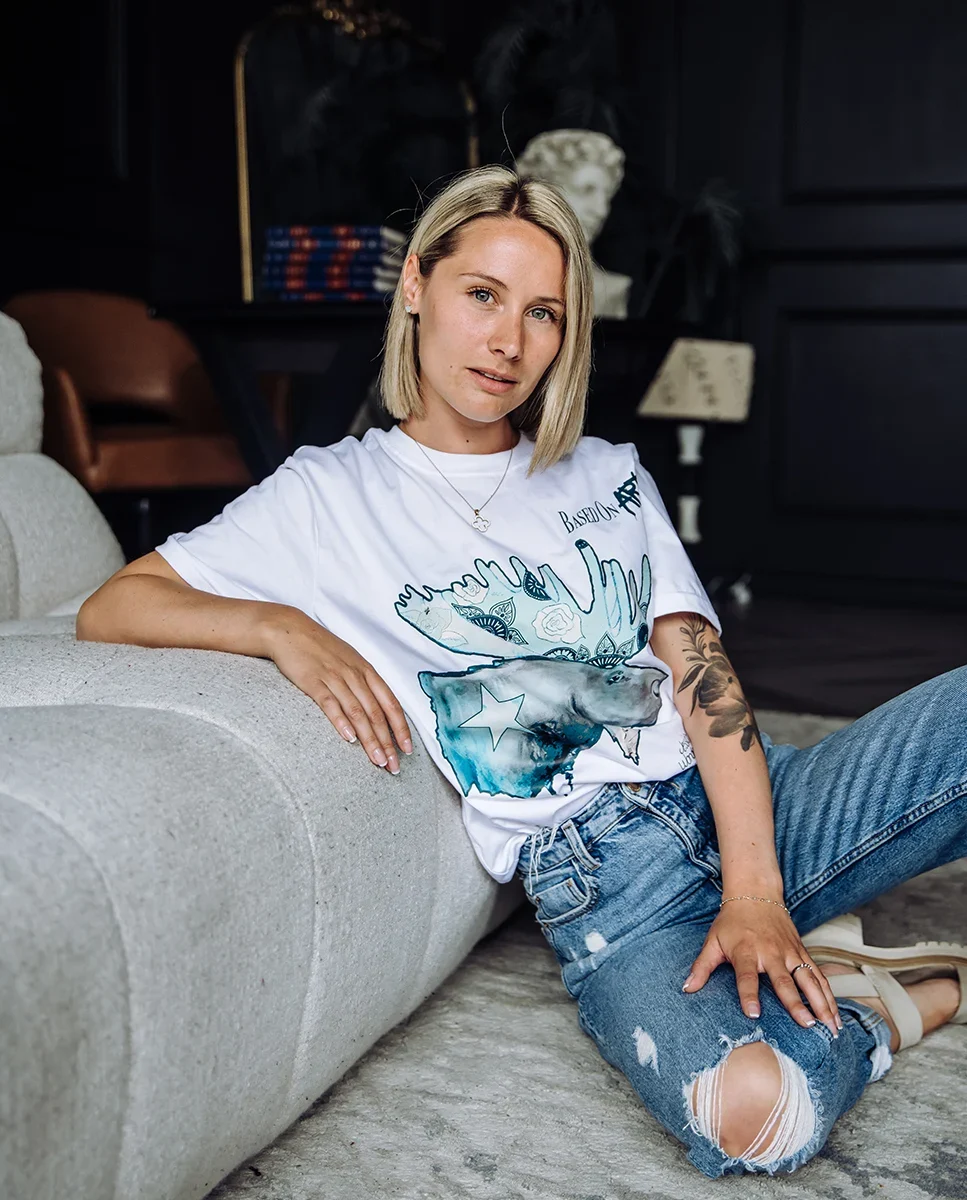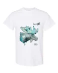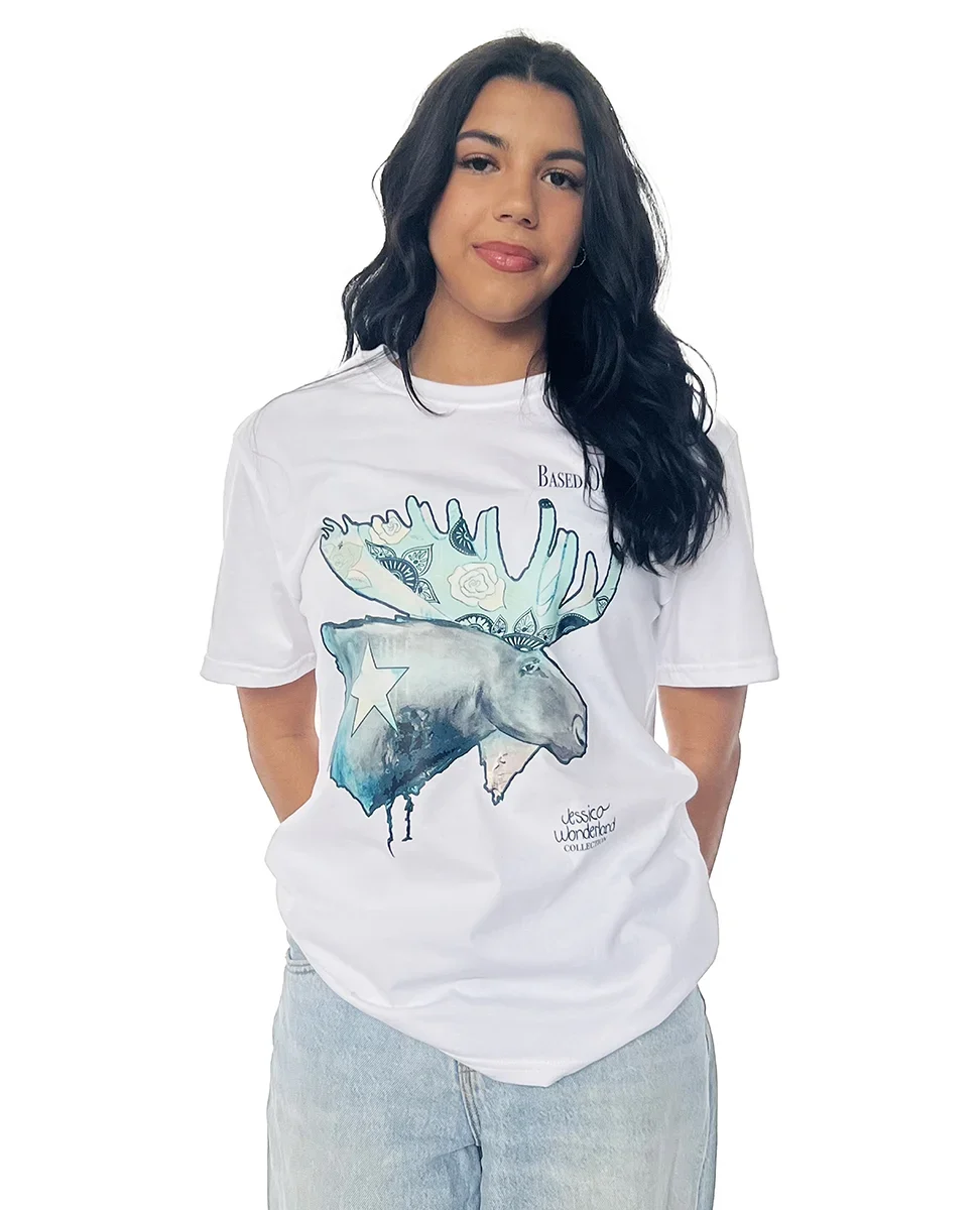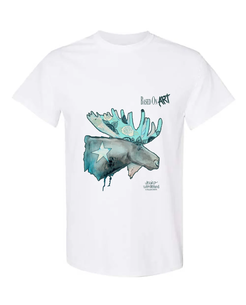 Turquoise Fashion Buck, a white artistic t-shirt designed by Jessica Wonderland for Based On Art is a refined fusion of contemporary art, streetwear, and visual storytelling. At the heart of the design stands a turquoise-toned moose, envisioned as a symbol of calm, peace, and inner serenity.