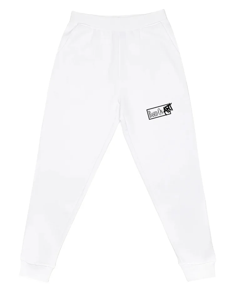The black Based On Art logo adds a sharp graphic contrast, reinforcing the piece’s minimalist yet confident aesthetic. The black-and-white palette gives these joggers a strong identity while keeping the design clean and wearable.