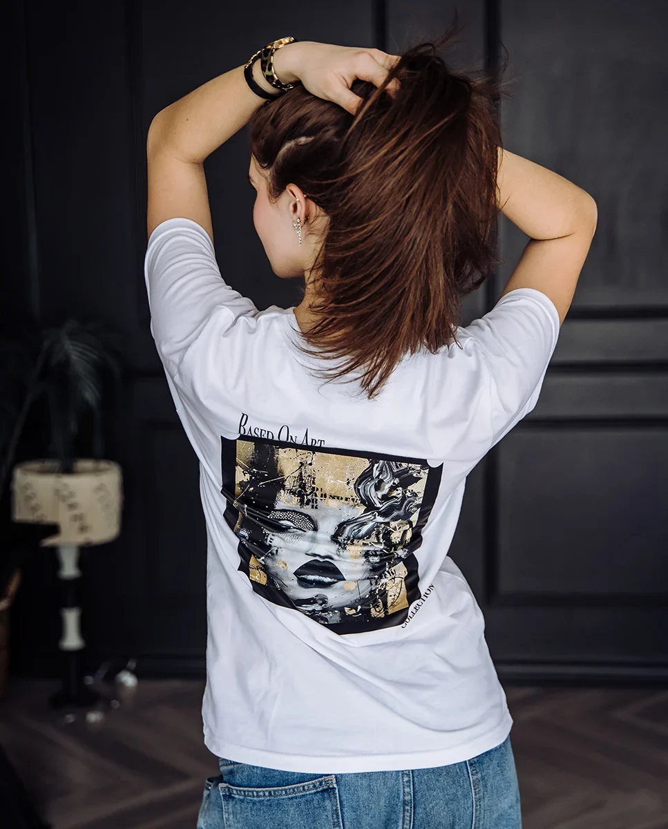 T-shirt blanc d’Émilie Gosselin pour Based On Art. Issu de sa série des sept péchés capitaux, ce design explore la luxure sous un angle sensoriel : textures et couleurs invitent à ressentir, laisser monter le désir et le transmuter en élan créatif.