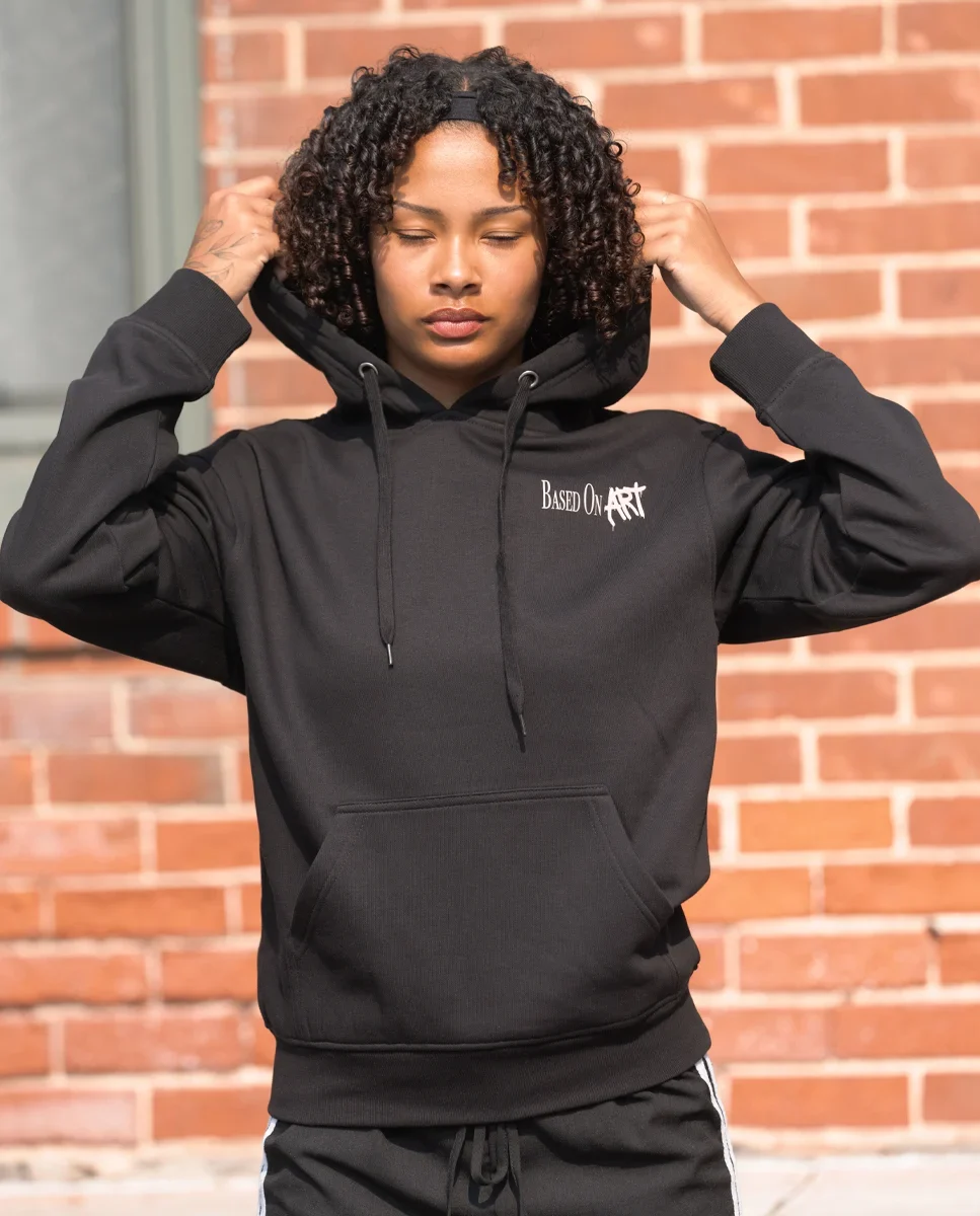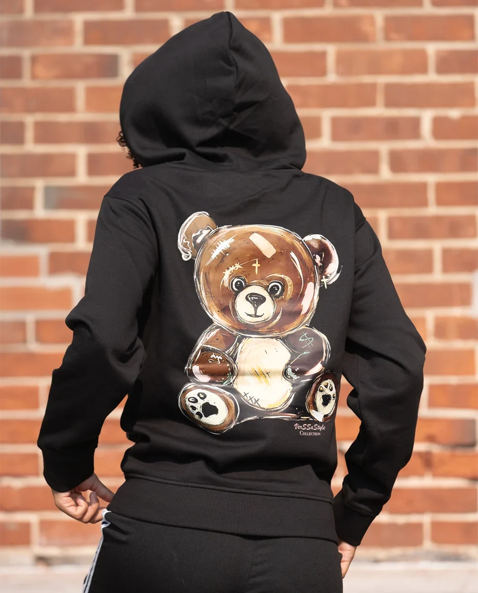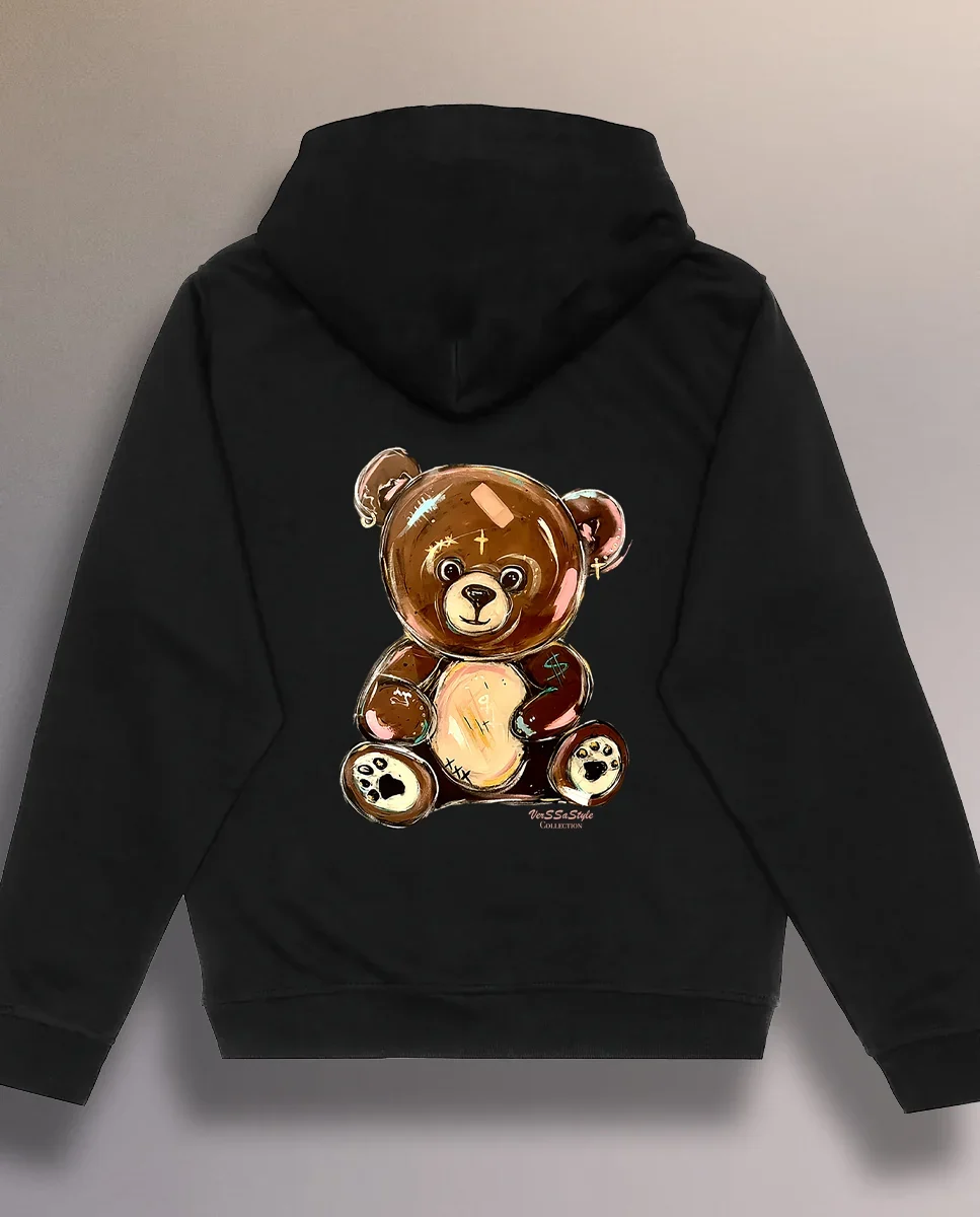 Le hoodie noir Teddy Bear de Based On Art, signé par l’artiste VerSSaStyle, propose une œuvre à la fois urbaine, stylée et chargée d’émotion. Au centre du design, un ourson en peluche revisité, légèrement funky, détourne les codes de l’enfance pour s’inscrire pleinement dans l’univers du streetwear artistique contemporain.