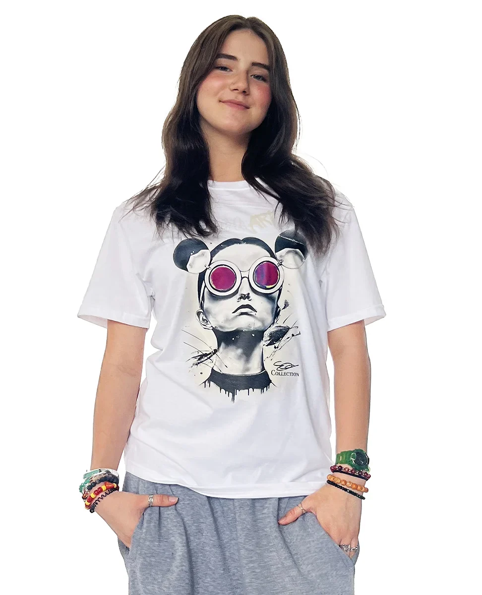 Le T-shirt blanc Vision propose une lecture lumineuse et contemporaine de l’univers artistique d’Émilie Gosselin. Sur fond clair, l’œuvre prend une nouvelle dimension : les lunettes holographiques deviennent une fenêtre ouverte sur la perception, révélant comment l’esprit filtre, transforme et réinvente la réalité selon ses désirs et ses émotions.